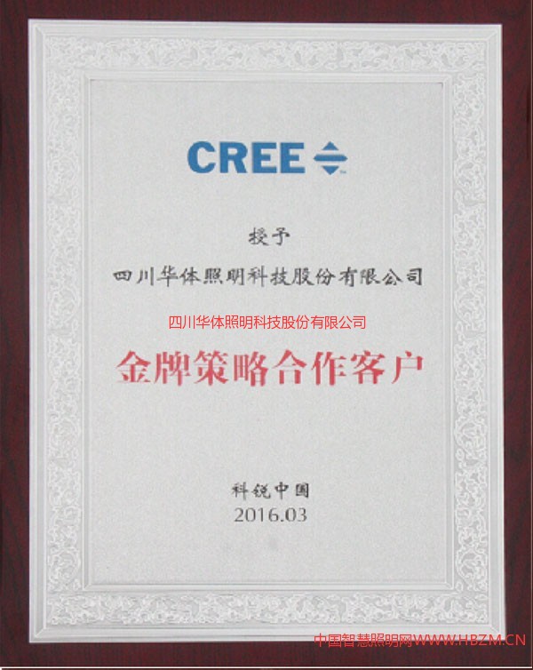 證書介紹 科銳中國授予四川華體照明科技股份有限公司金牌策略合作客戶