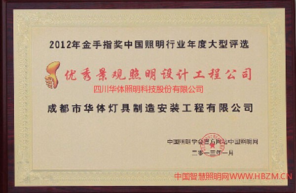 證書(shū)介紹 成都市華體燈具制造安裝工程有限公司榮獲2012年金手指獎(jiǎng)中國(guó)照明行業(yè)年度大型評(píng)選優(yōu)秀景觀(guān)照明設(shè)計(jì)工程公司