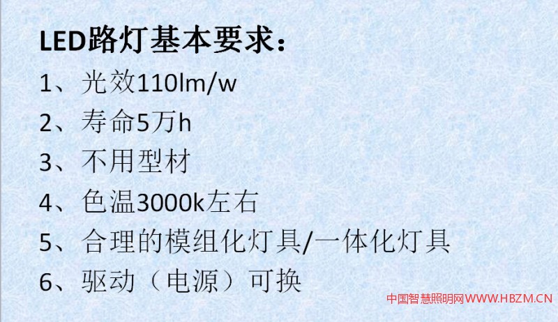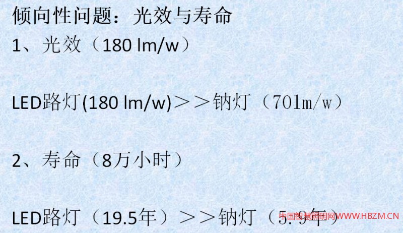 另外一個我認為呢我們做照明的有兩個傾向性的問題,也想跟大家探討一下。什么問題?第一個,我們因為前期的LED推廣應用存在的一些問題,直到現(xiàn)在為止,追求LED的高光效,180流明每瓦,這是燈具光效,不是那個芯片產(chǎn)品。但是我寫的低了。最近光亞展我去了幾個企業(yè),給我說200流明沒問題,這是一個傾向性的。那我們的鈉燈的光源可能120流明測算效率,維護系數(shù)可能也就70左右,我就打了兩個大于,大大大于鈉燈的光效,你還在追求光效,是不是?當然追求光效沒錯,我們恰恰在燈具的品質(zhì)上多加關(guān)注,這是一個傾向。