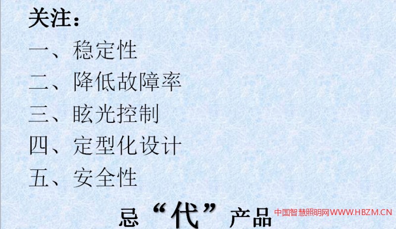 包括電視機原來修修就是換換電阻、電位器、電容或者電源變壓器壞了,現(xiàn)在電視機還這么休嗎?沒有,三大集成塊換了一組換掉,是不是?如果這個電視機用了十年了也不要了,可以換一個新型號了。老的電視機可能還好的,就不要了。那我們路燈雖然是一個國家的資源,是一個社會效益的一個工具。但是我們這個城市還是要跟這個形象要掛鉤的,這個燈壞了或者等老了,可能已經(jīng)不適合道路了,可能就不一定是修的,可能就是換了,所以我這里就寫的模組要適合不要太多。一個模組可換,也叫模組。不是說一定要一個燈源一定要拆成三個四個五個到九個,這才叫模組。第二個我還是建議一體化燈具,還有想法跟大家交流。第六個電源跟那個燈具相對還是比較簡單,現(xiàn)在有些城市喜歡把電源放在燈桿下面,所以這樣電源以后就方便了。剛才說的是我在對路燈led路燈的想法。另外我跟大家提出一個關(guān)注,就是說我們對LED路燈還要關(guān)注的幾點。第一個產(chǎn)品的穩(wěn)定性,包括質(zhì)量的穩(wěn)定性,第二個我們說流明維持率達到70,不小于70,5萬小時。但是你這個用上去,一下子就換半年,一年就壞了。這個故障要小,我們說0.5、0.3,我個人想法,起碼一百個里面換一個偶然因素還是正常的。另外一個還是個炫光問題,剛才也說過了,第四個定性化設(shè)計,定性化設(shè)計跟下面還是有關(guān)系的。最大的一個問題我放在最后什么呢?前一段有修改,包括鈉燈安全性不考慮,現(xiàn)在的行業(yè)標準驗收標準,把這些都放上去了,防下墜措施,防觸電等級是一類,燈具要接地線要放下去,好多東西燈具沒有,但是防下墜措施,我看了好像除了傳統(tǒng)燈具產(chǎn)業(yè)大部分人都搞不清楚。燈干與燈具的連接,在廣州光亞看好像做燈具的人不多,我們城市大家看到燈具會掉下來,我們以前掉下來就電源線掉在那里,過一會就砸下來,把人砸傷,上海以前都發(fā)生,現(xiàn)在幾乎沒有了,因為好多措施做了。安全是我們道路照明的基礎(chǔ)。上午廖總也講了好多觸電,其實這都在這個安全里面,但是我們燈具的安全這是最基本的,燈具安全都沒做到,這個照明系統(tǒng)怎么會做到這個安全性,希望大家關(guān)注,我到深圳去幾個企業(yè)跟他面談都沒概念,這是一個安全性,我們以后要把安全性作為我們道路照明的一個基礎(chǔ)。