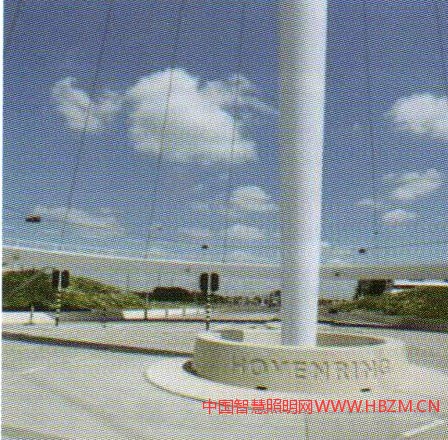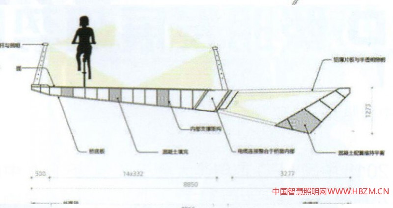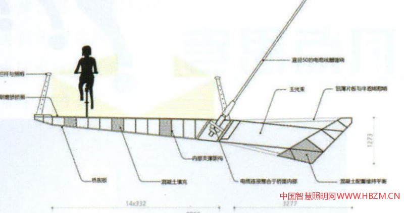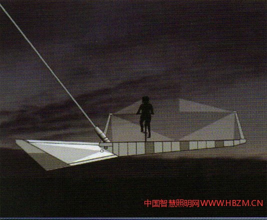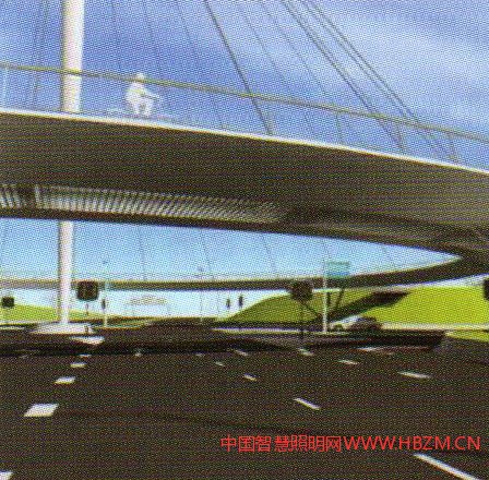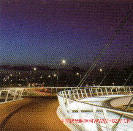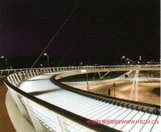 國(guó)外的許多著名橋梁為了保證設(shè)計(jì)師的整體理念的統(tǒng)一,都不設(shè)置燈桿,而采用其他照明方式。例如:Hungerford Bridge利用塔身安裝照明燈具;Bach deRodaBridge采用隔離帶與功能照明結(jié)合等做法,都把橋梁藝術(shù)與照明形式完美的結(jié)合在一起,給人們帶來(lái)與眾不同通行體驗(yàn)。以下是位于荷蘭埃因霍溫的一個(gè)圓環(huán)自行車(chē)交通天橋的設(shè)計(jì)(圖1)——結(jié)合功能景觀照明一體化設(shè)計(jì)的實(shí)際案例工程,希望對(duì)今橋梁或特殊造型橋梁的照明設(shè)計(jì)有所啟迪和幫助。