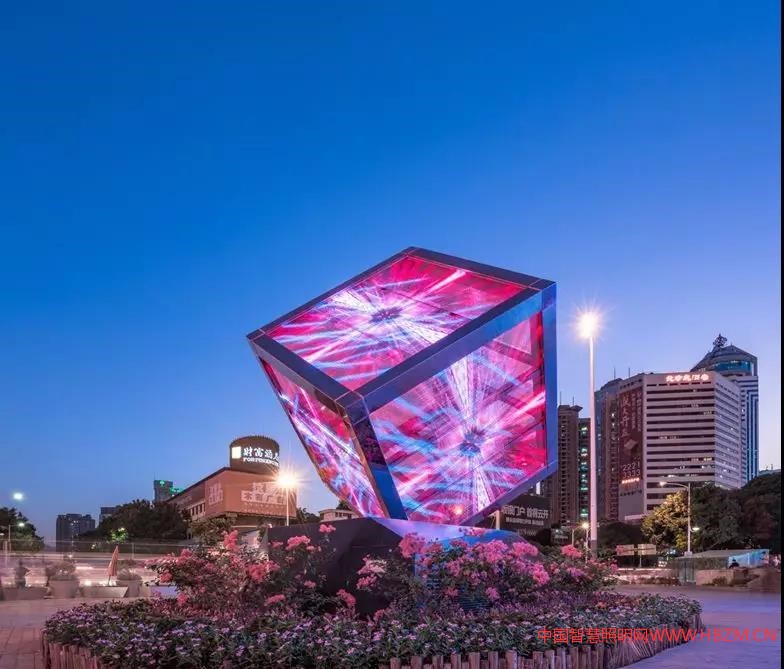 華強北街區(qū)經(jīng)改造后形成了全新的商業(yè)步行街,為配合該街區(qū)的定位,統(tǒng)籌設(shè)計了華強北步行街的建筑立面、廣告牌匾及景觀小品;營造以“科技、聚變、體驗、包容”為主題的燈光環(huán)境,同時創(chuàng)作出“魔方”光雕塑以及亞洲最大的全彩LED透明屏,同步設(shè)計及施工,將裝置藝術(shù)、廣告媒介、燈光雕塑、媒體動畫等融為城市景觀,體現(xiàn)了城市景觀一體化設(shè)計的獨特魅力。