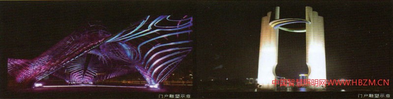 城市門戶、道路節(jié)點一門戶,高速收費站區(qū)域設(shè)立大型照明雕塑,突出南寧的門戶形象。在道路重要節(jié)點處設(shè)立小型照明雕塑,與大雕塑形成視覺連續(xù)性。