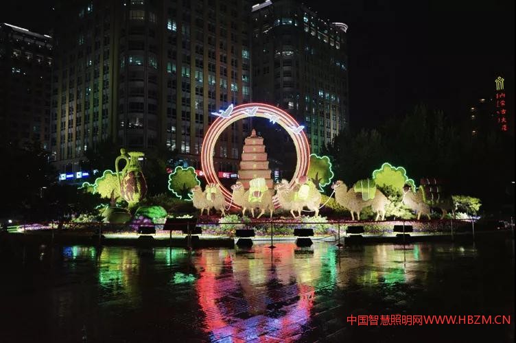 △東單路口的主題花壇以大雁塔為主景,下方的駝隊栩栩如生。