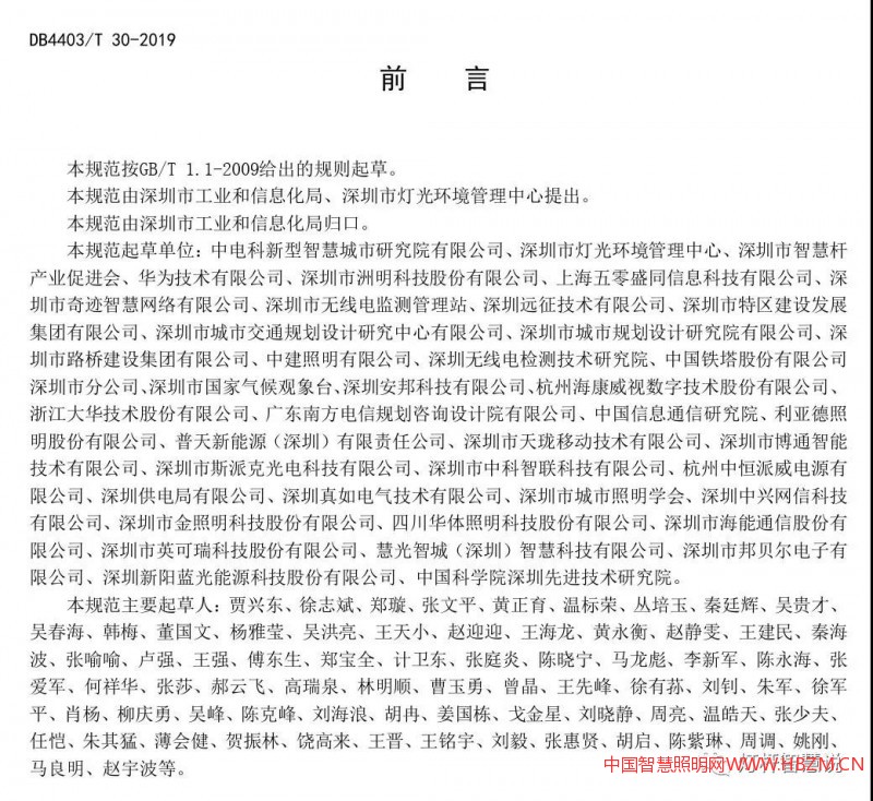 據(jù)文件顯示,參與該規(guī)范的起草單位共有41家,其中包含了智慧燈桿產(chǎn)業(yè)內(nèi)較為熟知的企業(yè),如:中電科新型智慧城市研究院有限公司、華為技術有限公司、深圳市洲明科技股份有限公司、上海五零盛同信息科技有限公司、深圳市奇跡智慧網(wǎng)絡有限公司、深圳市無線電監(jiān)測管理站、深圳市城市交通規(guī)劃設計研究中心有限公司、深圳市城市規(guī)劃設計研究院有限公司、中建照明有限公司、中國鐵塔股份有限公司深圳市分公司、深圳市國家氣候觀象臺、杭州??低晹?shù)字技術股份有限公司、浙江大華技術股份有限公司、廣東南方電信規(guī)劃咨詢設計院有限公司、中國信息通信研究院、利亞德照明股份有限公司、深圳市博通智能技術有限公司、深圳市斯派克光電科技有限公司、深圳市中科智聯(lián)科技有限公司、深圳供電局有限公司、深圳市城市照明學會、深圳中興網(wǎng)信科技有限公司、深圳市金照明科技股份有限公司、四川華體照明科技股份有限公司、深圳市英可瑞科技股份有限公司、慧光智城(深圳)智慧科技有限公司、中國科學院深圳先進技術研究院等。