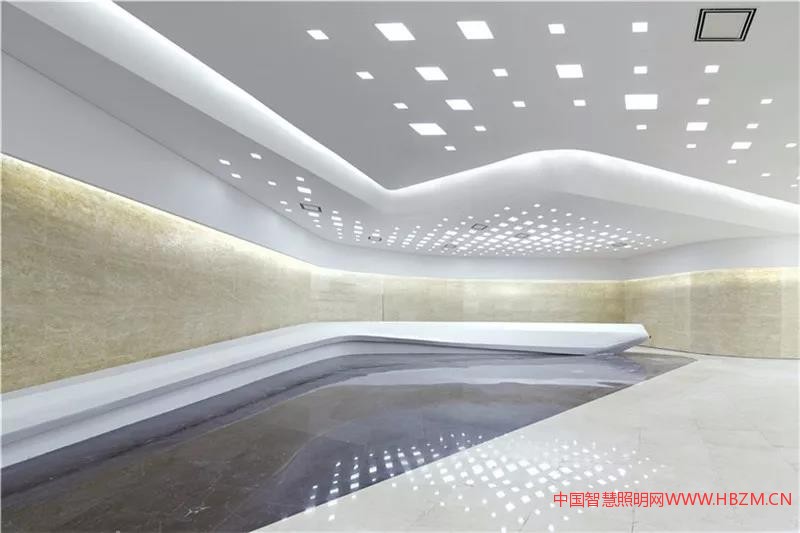 大小不一的白色發(fā)光體其實(shí)是裝飾性極強(qiáng)的造型,目的是在流動(dòng)中強(qiáng)調(diào)秩序與美感。為了達(dá)到極致的效果,不希望在天花中任何位置設(shè)置功能燈具來(lái)破壞這個(gè)整體的美,于是,采用了一種獨(dú)特的方式,即整個(gè)設(shè)計(jì)中不采用一盞筒燈,開始用發(fā)光膜作為主功能照明的嘗試。