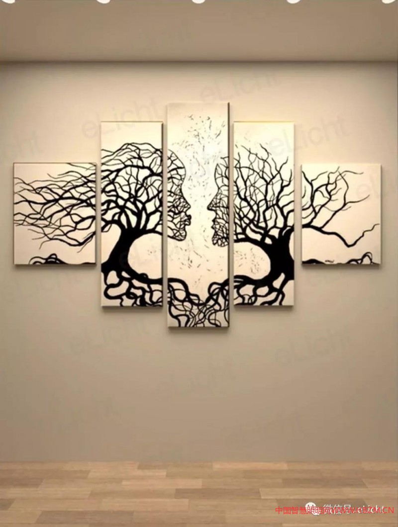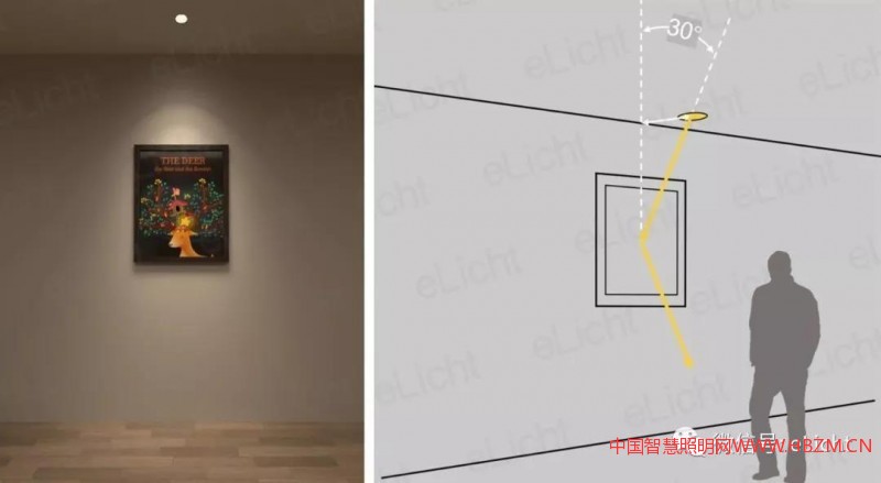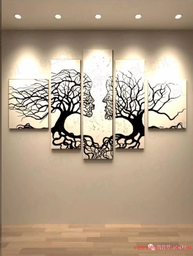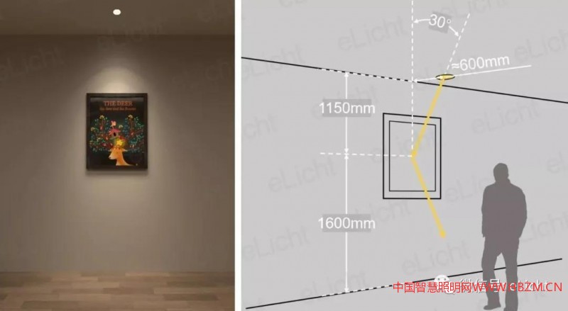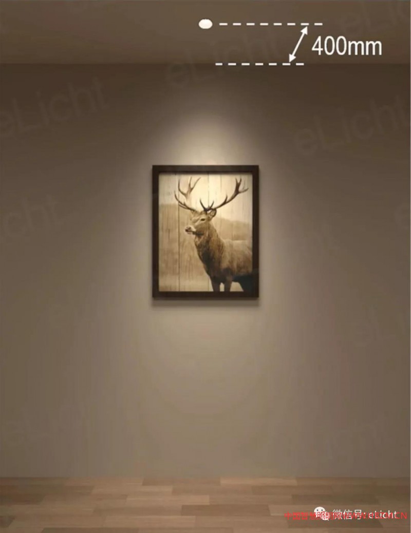 舉個(gè)例子,如果是一面2.75m 高的墻,一般符合視線的畫框安裝高度中心在1.6m,即中心點(diǎn)離天花距離大概1.15m,那么燈具離墻的位置大概是600mm。
