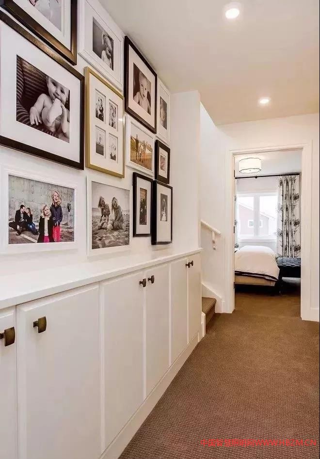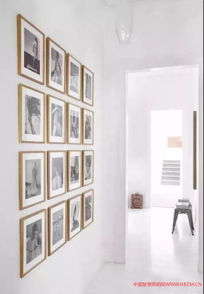 02照片墻,家庭照片記錄著生活的點(diǎn)滴,收藏著家人的笑容,將走廊的墻壁變?yōu)榧彝フ掌恼故緣σ彩且粋€(gè)特別的裝飾,但要是沒有燈光打亮看起來還是會欠點(diǎn)感覺,所以我們可以用射燈或者洗墻燈打亮它。