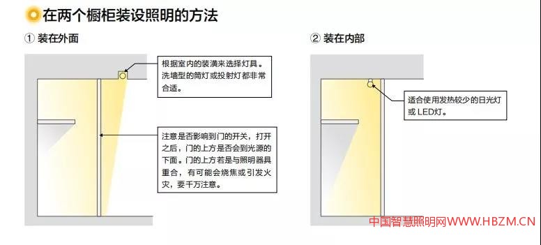 裝在外面的可根據(jù)室內(nèi)裝修來選擇燈具,洗墻型的筒燈或投射燈都十分合適。而在衣櫥內(nèi)部,則適合使用發(fā)熱較少的管狀 LED 燈或筒燈,通過門的限動(dòng)開關(guān)來控制照明燈具,也不會忘了關(guān)燈。還可以在層架設(shè)置燈帶補(bǔ)充照明。