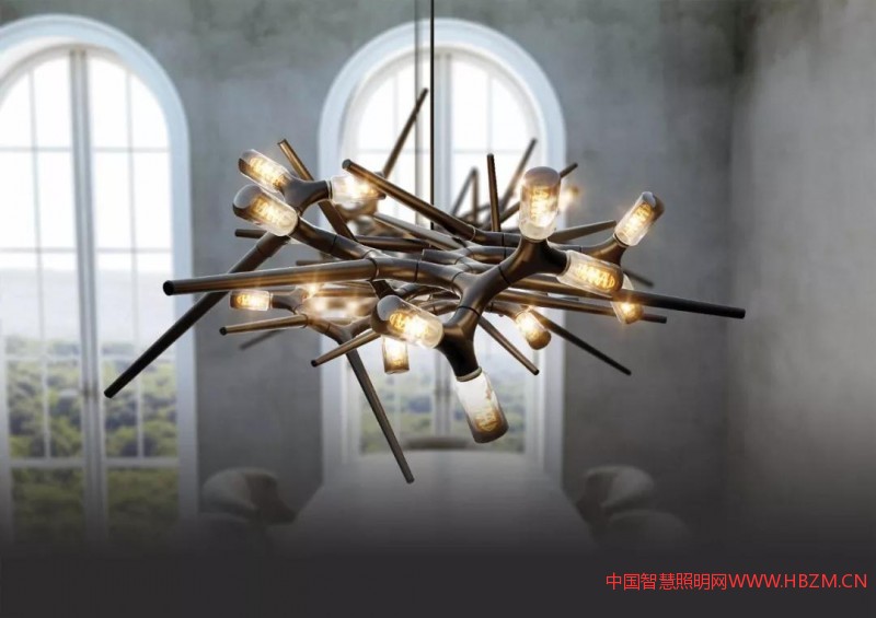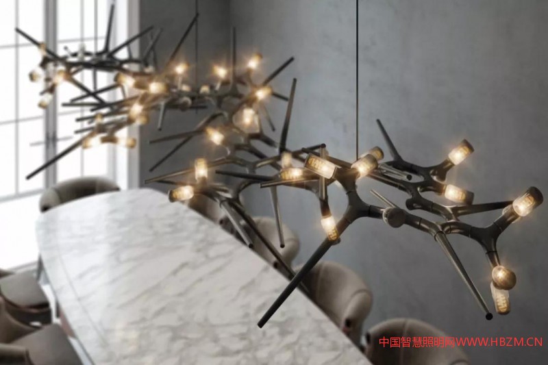 Thorn將照明元件和燈泡與樹(shù)枝狀的零件分開(kāi),通過(guò)在空間中添加不同的陰影來(lái)創(chuàng)建對(duì)比度。其主要靈感來(lái)自自然界中的有機(jī)形式及其生長(zhǎng)的隨機(jī)性。該結(jié)構(gòu)包括一個(gè)帶有三個(gè)關(guān)節(jié)的主干件,這些關(guān)節(jié)以120度角互鎖,然后將條狀的棍件和燈泡連接到此骨架以創(chuàng)建安裝。