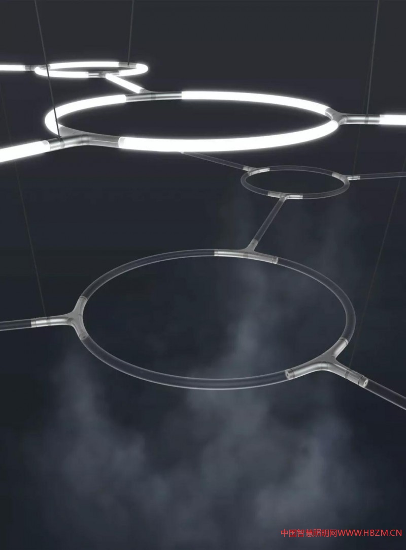 O–Mist/Light Diffusion System旨在在活動(dòng)期間和炎熱的夏季白天和傍晚恢復(fù)和冷卻城市中心的環(huán)境空氣。它在關(guān)鍵位置創(chuàng)建了一個(gè)照明霧云,以減少整個(gè)城市空間中的熱島效應(yīng)。其設(shè)計(jì)靈感來(lái)自分子結(jié)構(gòu)和水滴。懸浮式噴霧系統(tǒng)由兩個(gè)重疊的框架結(jié)構(gòu)組成,揭示了霧和光之間的相互作用。簡(jiǎn)單的圓形管道和黃銅接頭形成一個(gè)網(wǎng)絡(luò),通過(guò)壓力將霧擴(kuò)散到周?chē)?,在炎熱的夏天通過(guò)加濕空氣創(chuàng)造一個(gè)清新的綠洲。產(chǎn)生壓力的動(dòng)力裝置與水源相連,可以安裝在任何接觸不到的地方。