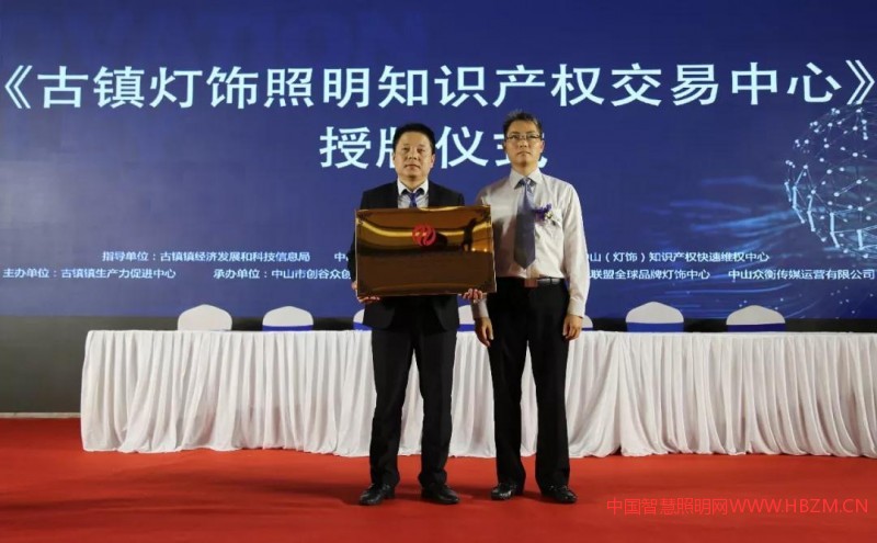 由古鎮(zhèn)鎮(zhèn)黨委委員周錦添授牌給鴻興創(chuàng)谷《古鎮(zhèn)燈飾照明知識(shí)產(chǎn)權(quán)交易中心》