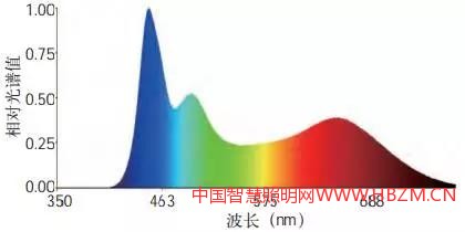 對(duì)于前些年被普遍使用的以三基色為主的熒光燈管,雖然合成了白色,但其紅、綠、藍(lán)光譜都是分立的(如圖3(b)),而且光譜的寬度很窄,下面連續(xù)部分的光譜強(qiáng)度相對(duì)比較弱,同時(shí)功率相對(duì)于LED等而言還是偏大的,1.5~3倍的能耗。因此,在使用效果上是不如LED燈的。