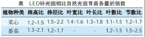 根據(jù)上述設(shè)計(jì)思路,研究團(tuán)隊(duì)進(jìn)行了一系列的實(shí)驗(yàn),實(shí)驗(yàn)效果十分顯著。比如,育苗助長(zhǎng)燈,原來(lái)使用的燈管是熒光燈,功率為32 W,育苗周期為40天。我們提供了一款12 W的LED燈,育苗周期縮短為30天,并有效地降低了育苗車間燈具溫度的影響,節(jié)省了空調(diào)耗電量。苗的粗壯度、長(zhǎng)度和顏色都好于原有的育苗方案。對(duì)于普通蔬菜的育苗,也獲得了很好的驗(yàn)證結(jié)論,其總結(jié)如下表所示。