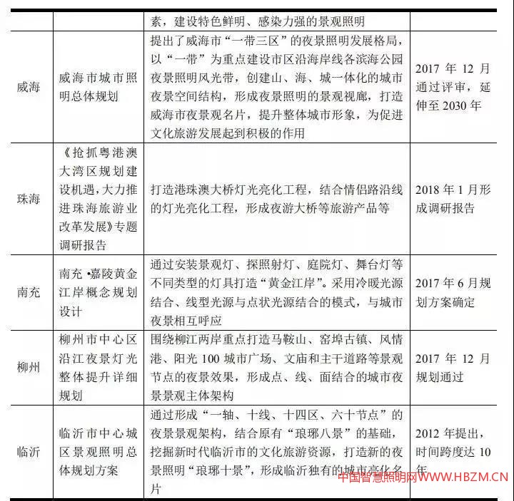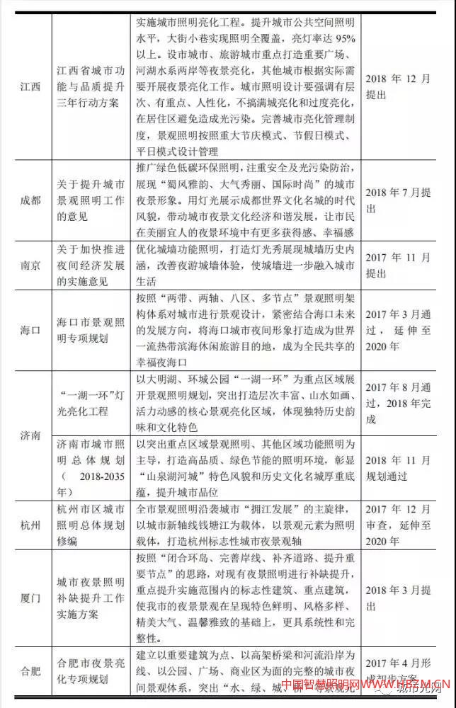 目前,不少城市已對當(dāng)?shù)匾咕敖ㄔO(shè)做了相應(yīng)的規(guī)劃,未來數(shù)年內(nèi)景觀照明作為城市夜景的重要構(gòu)成部分將迎來持續(xù)的需求。據(jù)不完全統(tǒng)計,2018年及以后部分城市的夜景建設(shè)規(guī)劃情況如下: