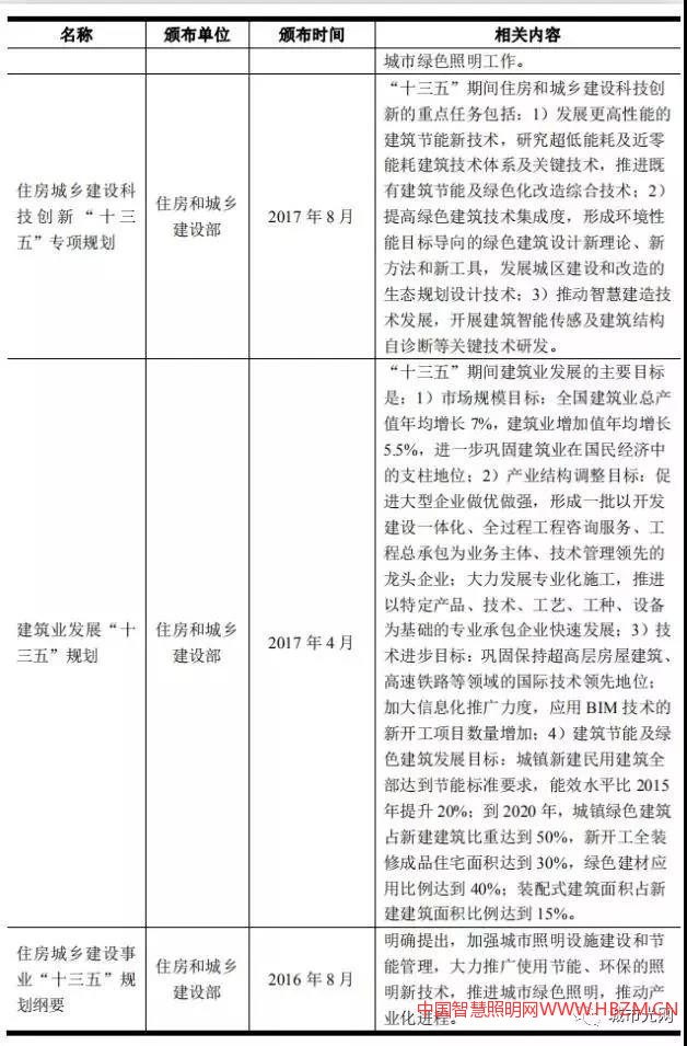 照明工程業(yè)務(wù)廣泛運用于城鎮(zhèn)化建設(shè)、市政建筑、智慧城市建設(shè)、文化旅游建設(shè)等領(lǐng)域,行業(yè)市場空間巨大,具有良好的市場前景。近幾年來,國家陸續(xù)制定了《戰(zhàn)略性新興產(chǎn)業(yè)重點產(chǎn)品和服務(wù)指導(dǎo)目錄》、《“十三五”節(jié)能環(huán)保產(chǎn)業(yè)發(fā)展規(guī)劃》、《關(guān)于印發(fā)“十三五”國家戰(zhàn)略性新興產(chǎn)業(yè)發(fā)展規(guī)劃的通知》、《“十三五”國家科技創(chuàng)新規(guī)劃》、《加快生態(tài)文明體制改革、建設(shè)美麗中國》、《國家新型城鎮(zhèn)化規(guī)劃》(2014-2020 年)、《“十三五”城市綠色照明規(guī)劃綱要》、《綠色建筑行動方案》、《關(guān)于開展特色小鎮(zhèn)培育工作的通知》等政策文件,均對照明工程行業(yè)的發(fā)展給予了極大的鼓勵和政策支持。