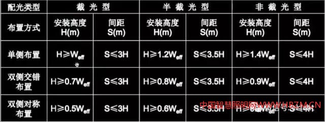 那么在路燈中,燈具的配光類型、布置方式與燈具的安裝高度、間距之間有什么聯(lián)系呢?請看下表