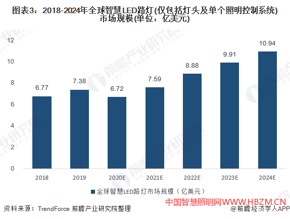根據(jù)集邦咨詢TrendForce研究數(shù)據(jù)顯示,2019年,全球智慧LED路燈市場(chǎng)規(guī)模為7.38億美元,到2024年,全球LED智慧路燈市場(chǎng)規(guī)模將達(dá)到10.94億美元(僅包括燈頭及單個(gè)照明控制系統(tǒng)),2019~2024年市場(chǎng)年復(fù)合增長(zhǎng)率為8.2%。