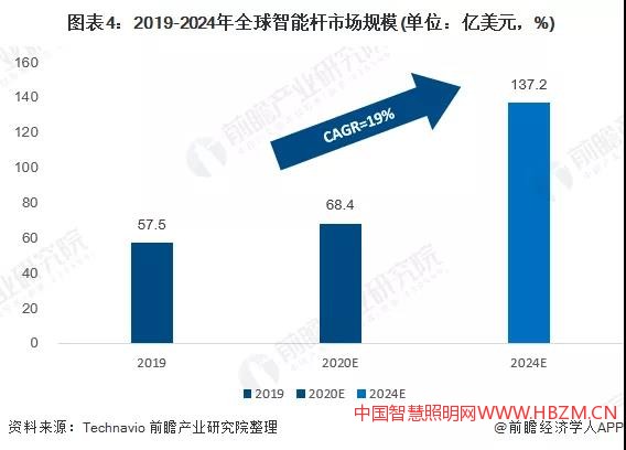 另根據(jù)Technavio發(fā)布的“2020~2024年全球智能桿市場(chǎng)”報(bào)告數(shù)據(jù)顯示,2019年,全球智能桿市場(chǎng)規(guī)模為57.5億美元左右,2020~2024年,全球智能桿市場(chǎng)規(guī)模將增長(zhǎng)79.7億美元,達(dá)到137.2億美元左右,年復(fù)合增長(zhǎng)率達(dá)到19%。