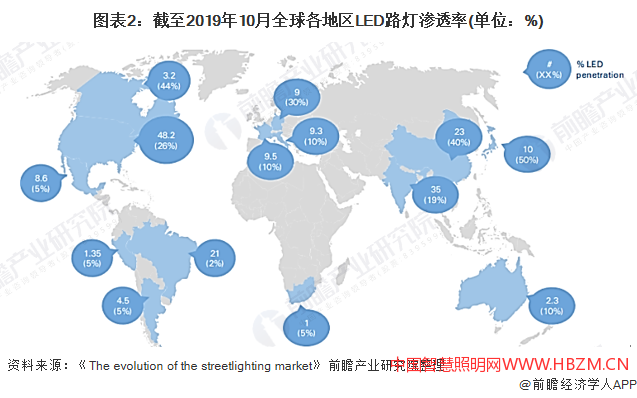 根據(jù)Arthur D Little于2019年10月發(fā)布的《The evolution of the streetlighting market》報(bào)告數(shù)據(jù)顯示,在全球范圍內(nèi),約有3.2億條路燈桿,其中亞洲占25%、歐洲和北美占20%,南美占10%。因?yàn)閲?guó)家及城市發(fā)展不同,LED滲透率、商業(yè)模式也有所不同。截至2019年10月,全球LED路燈滲透率仍低于15%,各國(guó)之間存在明顯差異,例如日本和加拿大LED滲透率較高(約為44~50%),而南美顯示的滲透率低于5%。在歐洲地區(qū),普及率約為10%,在美國(guó)地區(qū)則為26%。