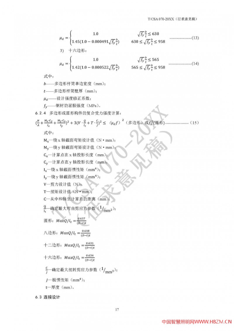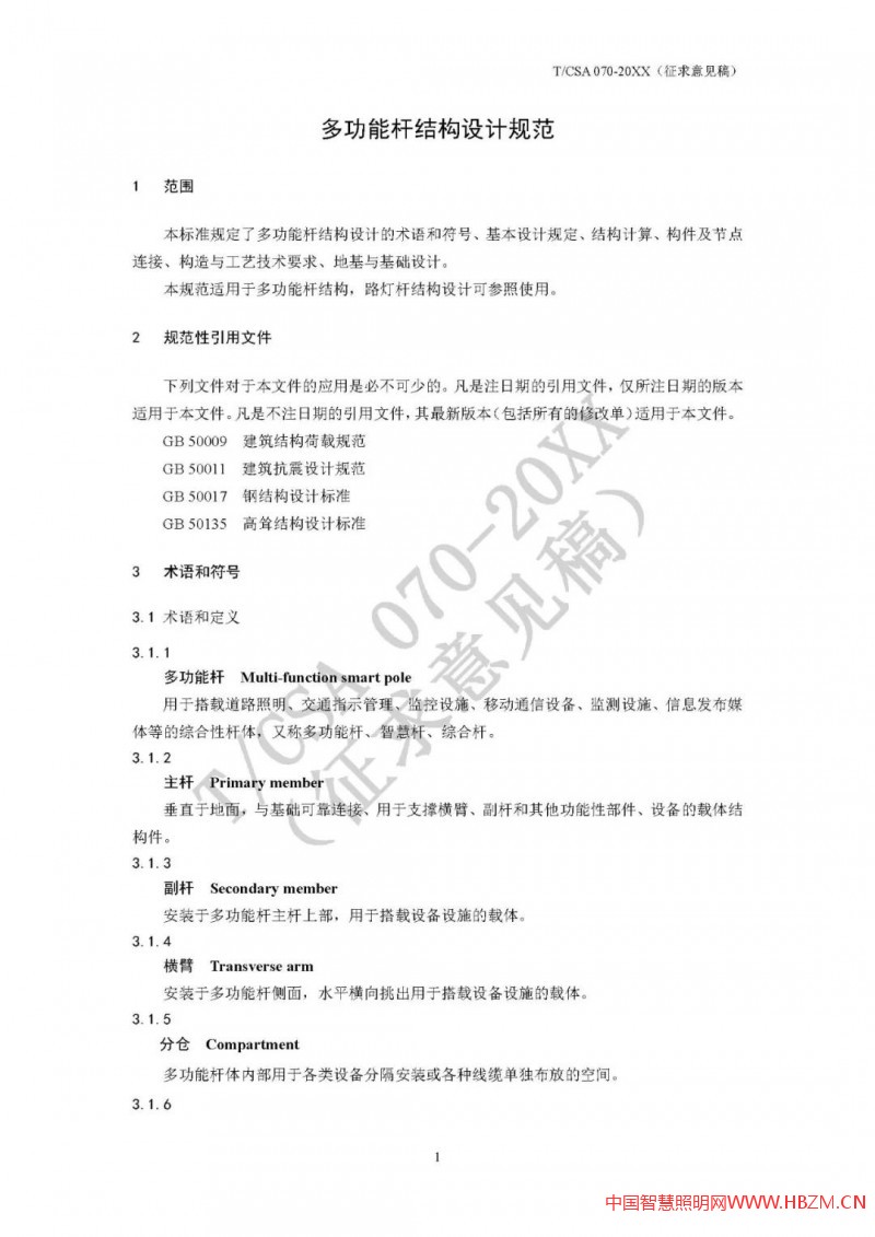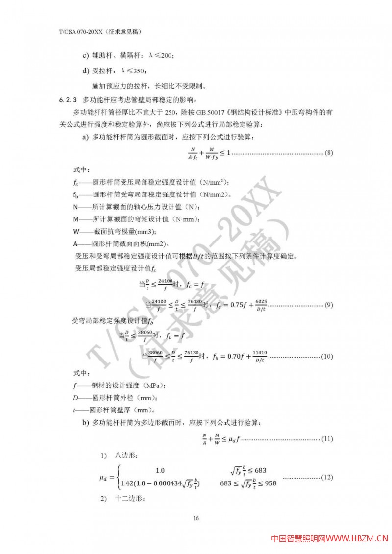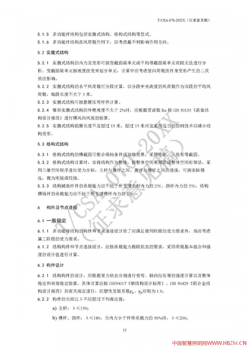 對于多功能桿件,因其加載設(shè)備多,有些桿件(如路燈桿兼做交通F桿)挑臂較長、重量較大、迎風(fēng)面積也較大,結(jié)構(gòu)安全性尤為重要,其設(shè)計(jì)方法也較為專業(yè)、復(fù)雜。為統(tǒng)一多功能桿件設(shè)計(jì)和驗(yàn)算方法,國家半導(dǎo)體照明工程研發(fā)及產(chǎn)業(yè)聯(lián)盟(CSA)專門草擬了《多功能桿結(jié)構(gòu)設(shè)計(jì)規(guī)范》(T/CSA 070),并于2020年底面向行業(yè)廣泛征求意見。