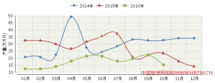 2016年1~10月福建LED累積產(chǎn)量約176億只