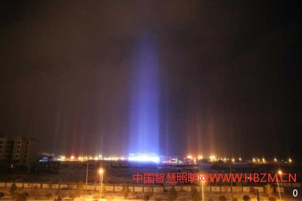 城市照明燈光被反射成一道道色彩斑斕的光柱,如夢似幻。建筑物的