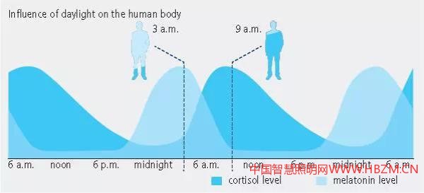 藍(lán)光會(huì)否產(chǎn)生危害,其實(shí)不是一個(gè)定性的問題,而是一個(gè)定量的問題,需要看光源光譜里所含的藍(lán)光成分的多少。因?yàn)?,日光中本來就包含有藍(lán)光成分。上圖是自然光線下,人體在一天中所產(chǎn)生的荷爾蒙可的松和褪黑激素的變化曲線(荷爾蒙可的松可以刺激人體的新陳代謝)。