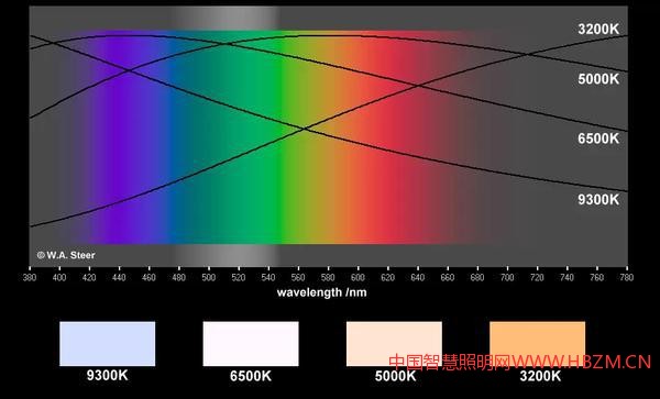 下圖是日光光譜表現(xiàn)出不同色溫時(shí),光譜成分的變化曲線,大家從中可以看出色溫的原理,并作為看光源光譜時(shí)的比對(duì)借鑒(光源顯色性評(píng)估的最佳方式也是通過光譜分析):