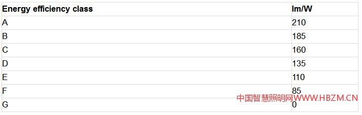 -新法規(guī)對能效等級的計算有了重大的變更,不再需要根據(jù)復雜的公式計算,直接按照光效確定能效等級,初步的等級劃分如下: