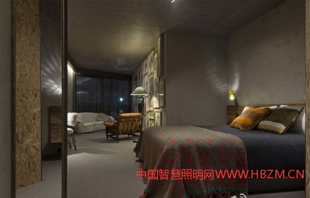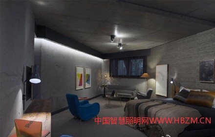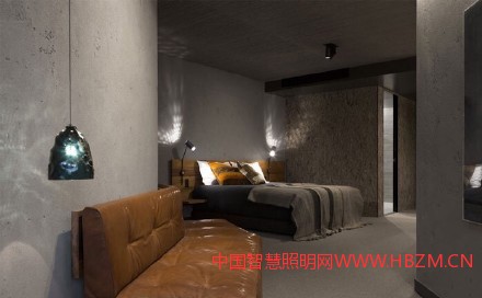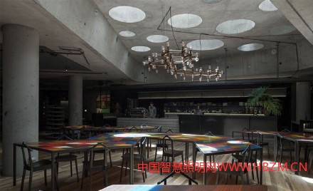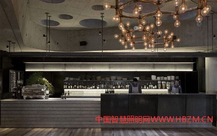穿孔水泥天花板和黃銅制的燈具讓照明也變得精彩