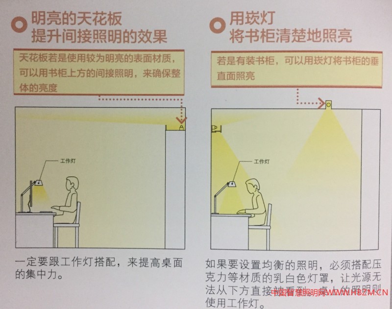 書房和臥室較多的使用間接光源可以創(chuàng)造出充滿氣氛的空間,重點(diǎn)是要用臺(tái)燈、工作燈來填補(bǔ)所需要的 亮度。