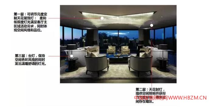 圖:以常見的客廳為例,空間里使用觀賞性及實用性的燈具可以滿足空間對燈光多層洗的要求。