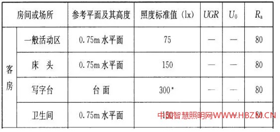 進行酒店燈光設計之前我們需要先了解一下關于酒店客房各個區(qū)域的照度要求,一般有:一般活動區(qū)、床頭、寫字臺,衛(wèi)生間等各個區(qū)域的標準。