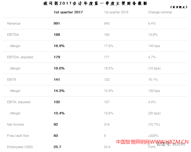 歐司朗2017會(huì)計(jì)年度首季財(cái)報(bào)重點(diǎn): - 第一季度營(yíng)收比上年同期可比增長(zhǎng)近8%; - 調(diào)整后息稅折舊攤銷(xiāo)前利潤(rùn)率為18.0%; - 歐司朗2017財(cái)年展望已獲確認(rèn)。