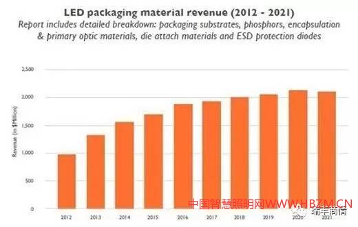 隨著通用照明市場的興起,LED封裝要求封裝材料能夠滿足應(yīng)用要求。對于封裝基底,高功率密度器件開始采用陶瓷基底,該市場預(yù)計將從2015年的6.84億美元增長至2021年的8.13億美元。受硅樹脂材料的應(yīng)用增長驅(qū)動,密封/鏡片材料也將保持增長趨勢(預(yù)計將從2015年的4億美元增長至5.26億美元),硅樹脂材料相比傳統(tǒng)的環(huán)氧樹脂材料具有更高的可靠性和更長的使用壽命。對于熒光材料市場,2017年主要的YAG(釔鋁石榴石)專利即將到期,該市場將面對大量產(chǎn)品商業(yè)化,以及價格壓力。因此,該領(lǐng)域市場預(yù)計將從2015年的3.39億美元僅增長至2021年的3.46億美元。
