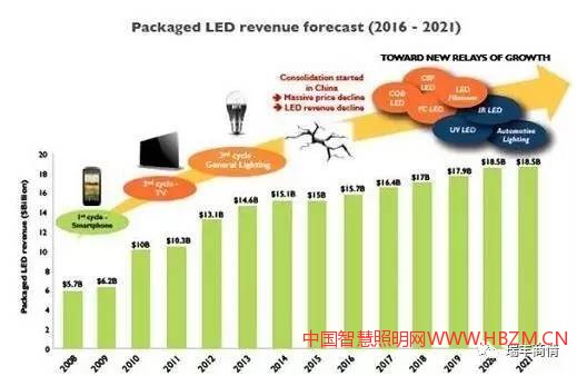 2016年,LED產(chǎn)業(yè)開始復(fù)蘇,已封裝LED產(chǎn)品的平均售價對于低功率2835和中功率5630等高度商品化庫存單位已經(jīng)趨穩(wěn)。照明應(yīng)用的高功率等級LED需求看漲,不過該領(lǐng)域競爭仍很激烈,隨著競爭的加劇,產(chǎn)品平均售價或?qū)@著下降。因此,本報告預(yù)計已封裝LED市場將在未來幾年保持溫和增長,到2021年將增長至185億美元(2016~2021年期間的復(fù)合年增長率為3.4%)。