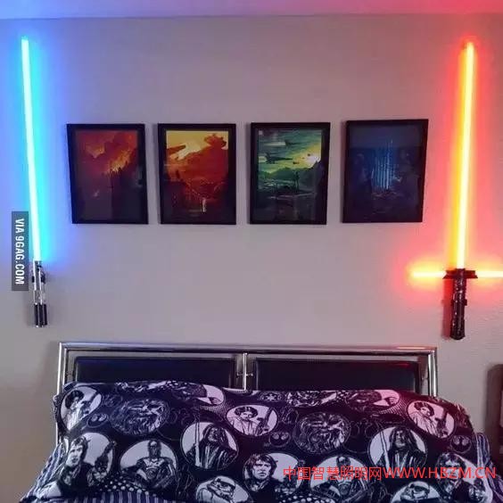不用仔細欣賞墻上的掛畫和床上的被套,單單這兩把“光劍”就足以證明主人的偉大追求了。