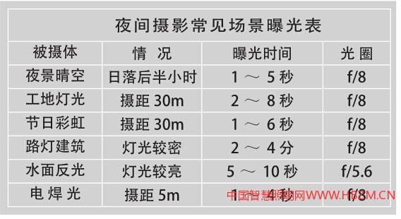 除了借助相機的內(nèi)測光系統(tǒng)進行測光外,經(jīng)驗豐富的攝影師往往自有一套控制曝光的方法,下表所列的,是一些常見的夜間攝影場景和曝光數(shù)據(jù),可供影友們使用參考,拍攝時ISO為100,光圈與快門速度的組合,可以視情況進行互易調(diào)整。