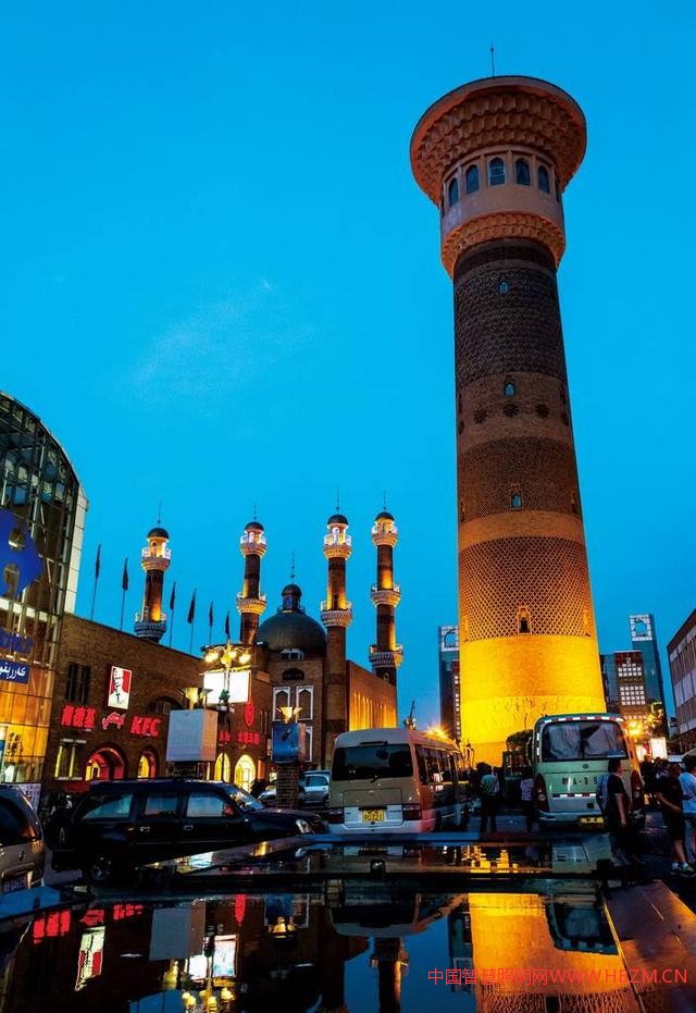 用機位法拍攝夜景,比較方便的是在多區(qū)域矩陣式測光方式下,采用自動曝光的光圈優(yōu)先模式進行。一般情況下,天色處于藍色或淺灰,房屋建筑的輪廓尚能分辨,燈光比較明亮但照亮的區(qū)域不大時,可不作曝光補償,如圖13-3所示;而天色轉(zhuǎn)黑,天空面積又相對較大時,就須將曝光補償設(shè)置成“-”的狀態(tài),如圖13-4曝光補償為-1級。如果在多區(qū)域評估測光方式下采用手動曝光,測光時仍應(yīng)按不同情況加以處理,如圖13-3應(yīng)將游標調(diào)至中間“0”的位置,而圖13-4則調(diào)到-1級的位置。