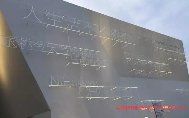 圖:2015年意大利米蘭世博會教皇圣座館。下面地面一排洗墻燈向上照,功率不大,功能是體現(xiàn)建筑的整體折彎、凹凸感。另外在右邊遠(yuǎn)處,有大功率泛光燈,對著凸出的字體照射,把陰影投在墻面。(圖片來源:Google)