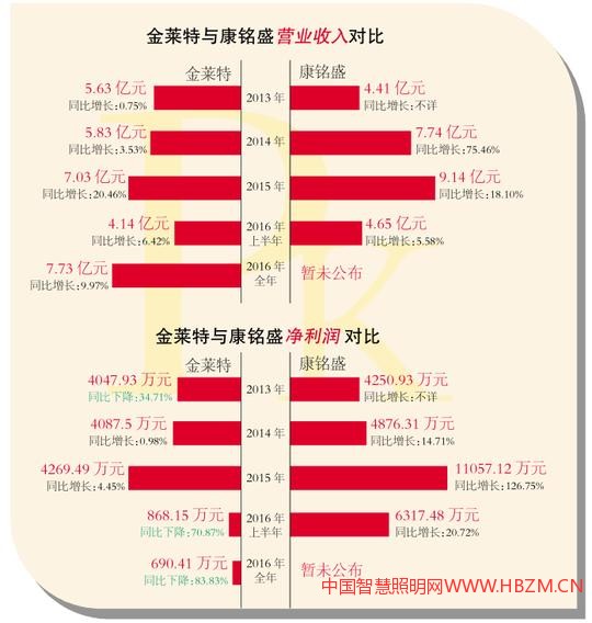 而2016年上半年數(shù)據(jù)看來,金萊特可充電備用照明燈具產(chǎn)品營(yíng)收2.22億元,康銘盛移動(dòng)照明設(shè)備產(chǎn)品營(yíng)收卻達(dá)到4.02億元,同為移動(dòng)照明企業(yè),康銘盛在移動(dòng)照明領(lǐng)域的銷售額也已經(jīng)遠(yuǎn)超金萊特。