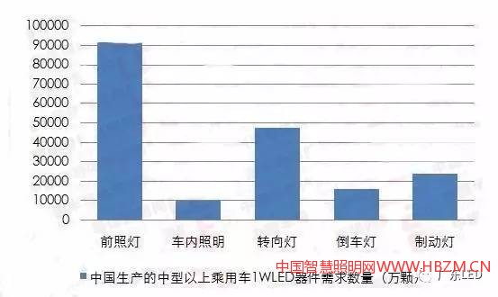 汽車照明:主要包括汽車照明燈具(前照燈、霧燈、牌照燈、儀表燈、頂燈、工作燈等)和汽車信號燈具(轉(zhuǎn)向燈、報警燈、示寬燈 、尾燈、制動燈、倒車燈 等)。據(jù)中國汽車工業(yè)協(xié)會統(tǒng)計,2016年1-10月,中國乘用車產(chǎn)量1884萬輛,其中中型以上乘用車產(chǎn)量1064萬輛,預計全年中型以上乘用車產(chǎn)量1318萬輛。據(jù)測算,中型以上乘用車對LED器件總需求量約22億顆(按1W/顆折算),形成的市場需求規(guī)模約450億元。