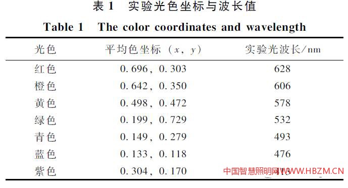 在本實驗中所選用的色光刺激是由紅、橙、黃、綠、青、藍、紫等7種純色組成。利用TOPCON BM-7A亮度計分別測量的實驗平均色坐標(biāo),以及對應(yīng)的波長見表1。