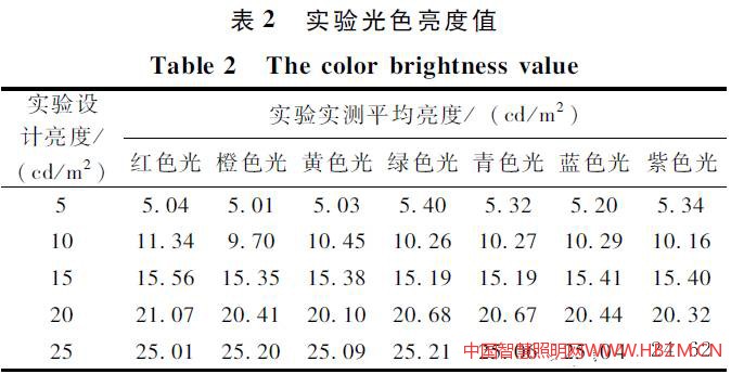 參考《城市夜景照明設(shè)計規(guī)范》(JGJ/T 163-2008)[1],實驗色刺激的亮度范圍在5—25cd/㎡之間變化,并將色刺激的亮度水平等量劃分為5等份,即分別為5cd/㎡、10 cd/㎡、15 cd/㎡、20 cd/㎡和25 cd/㎡。利用TOPCON BM-7A亮度計分別測量的不同亮度水平下的實驗平均亮度見表2。
