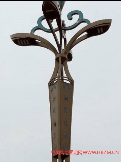 為突出洞庭湖當(dāng)?shù)氐暮^(qū)文化,在燈桿中部加裝刻有“洞庭荷風(fēng)”字樣的燈箱。晚上亮燈后,內(nèi)透光展示出“洞庭荷風(fēng)”,別具一格。