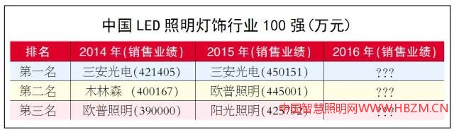 但今年大不一樣,隨著一些照明企業(yè)銷售業(yè)績(jī)的巨大突破,邁入“50億元”“60億元”大關(guān)等喜訊不斷傳來:“三安光電‘保一艱難’?”“大雷士已鎖定‘百?gòu)?qiáng)榜’前三名?”“飛樂音響將成‘百?gòu)?qiáng)榜’最大黑馬?”“木林森去年?duì)I收實(shí)現(xiàn)大幅增長(zhǎng)?”再加上歐普照明、三雄極光等照明企業(yè)成功上市,今年前三甲“懸念”倍增,榜單“很有看頭”。