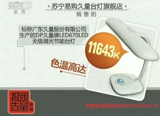 蘇寧易購(gòu)久量臺(tái)燈旗艦店銷售的標(biāo)稱廣東久量股份有限公司生產(chǎn)的DP久量牌一款LED670LED無(wú)級(jí)調(diào)光節(jié)能臺(tái)燈的色溫高達(dá)11643K。而在記者此前的調(diào)查中,這款臺(tái)燈在網(wǎng)購(gòu)平臺(tái)上宣稱是不傷眼睛的護(hù)眼燈。