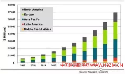 據(jù)Navigant Research調(diào)研顯示,2017年全球智能路燈市場價值將達(dá)到6.1億美元,并在2026年增長到69億美元。市場份額預(yù)計將從2017年的2%增長到2026年的20%左右??梢钥吹?,目前LED照明已成為全球大多城市傳統(tǒng)街道照明的標(biāo)準(zhǔn)替代品,智能控制開始變得越來越廣泛,并且逐漸與LED照明一起進(jìn)行部署。