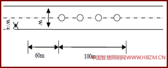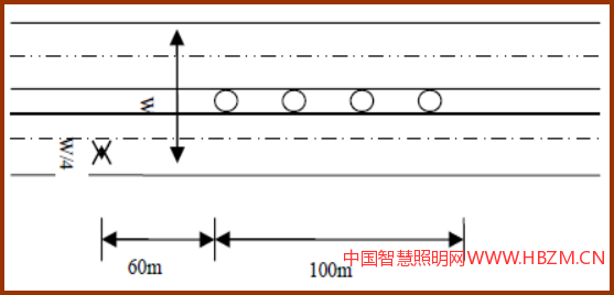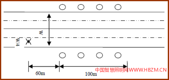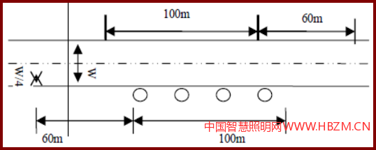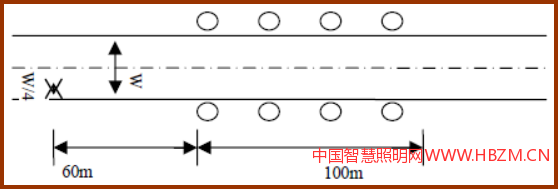 B、亮度計的觀測點的縱向位置:應(yīng)距第一排測量點為60m,縱向測量長度為100m(圖B)